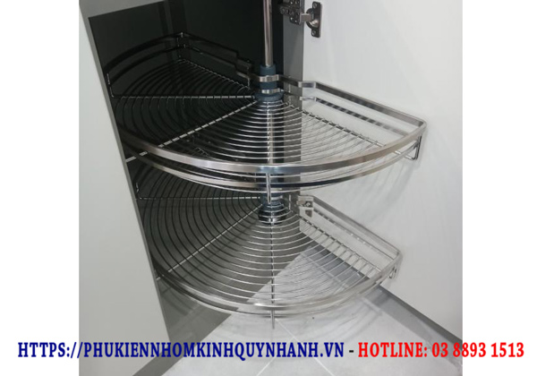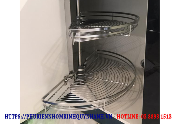 - Mâm xoay gồm 2 tầng khay inox nan dẹt, tối ưu hóa khả năng lưu trữ các vật dụng nhà bếp như xoong nồi, bát đĩa, chai lọ.