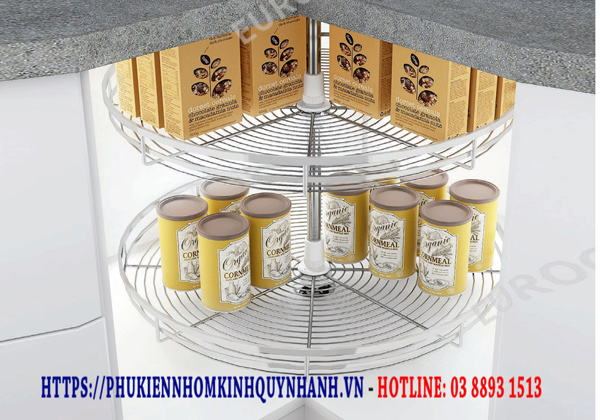 Sản phẩm được thiết kế thông minh với 2 tầng mâm rộng rãi, giúp người dùng lưu trữ được nhiều vật dụng như xoong nồi, bát đĩa, hộp gia vị hay thớt. Từng tầng mâm có thể xoay độc lập, cho phép bạn dễ dàng lấy đồ dùng dù ở góc khuất của tủ bếp.
